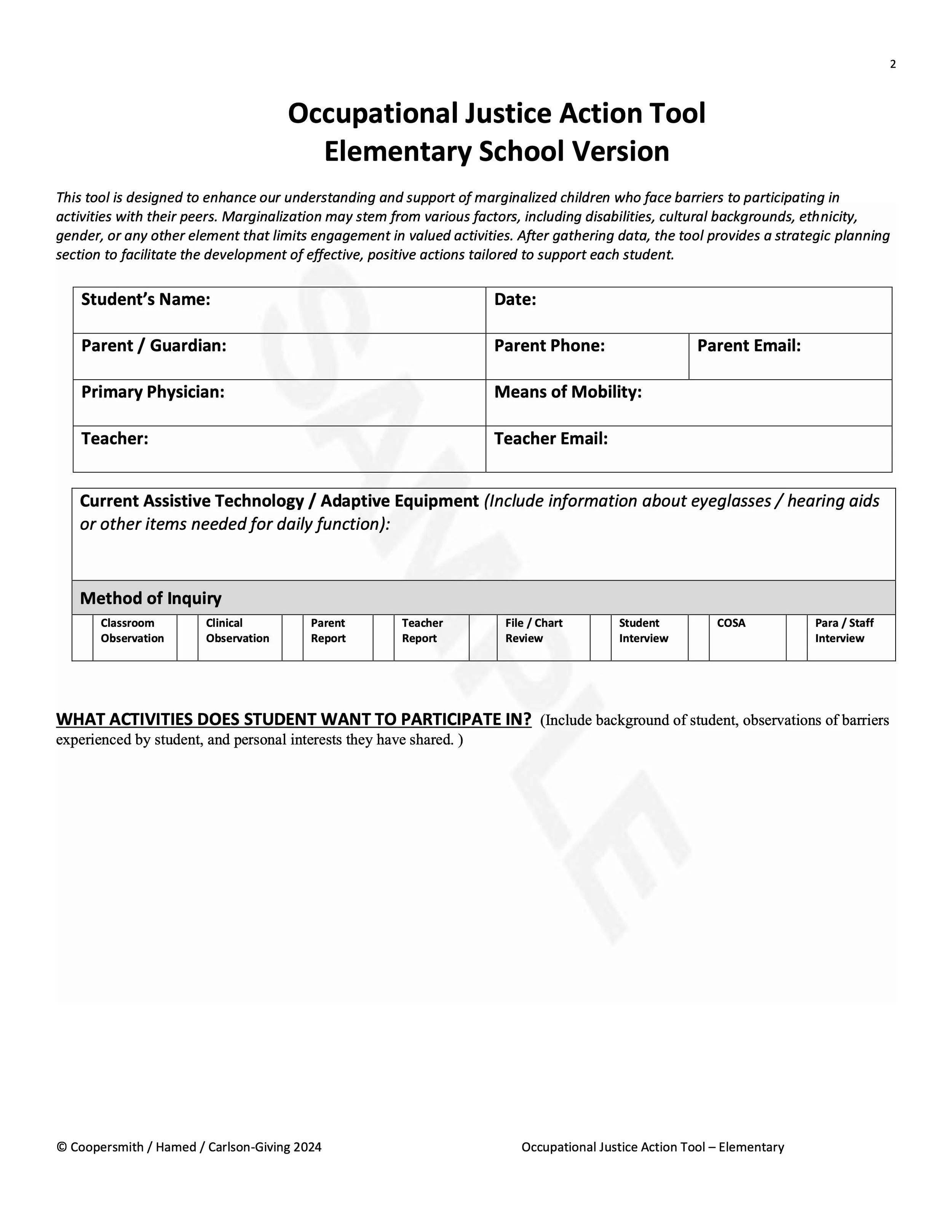 2. Fill out the appropriate OJAT: Collect information on the student’s positive and negative experiences in daily activities. This data can be obtained from teachers, parents, your own observations, though ensure prioritizing the student’s voice when possible Include details such as: